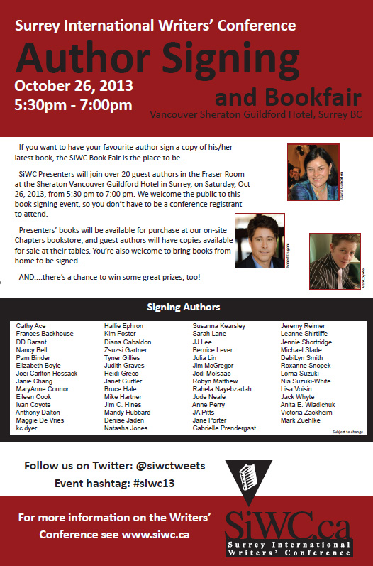 I am excited to be attending the Book Fair at the SIWC as part of the Celebrating Creative Writing Week. The event is free to the public and there is a great line-up of best sellers :) Come early and attend the Trade Show (8:30 am to 4:00 pm) which is an integral part of the conference. Expect to meet editors, illustrators, associations and retailers from every part of the writing and publishing industry.